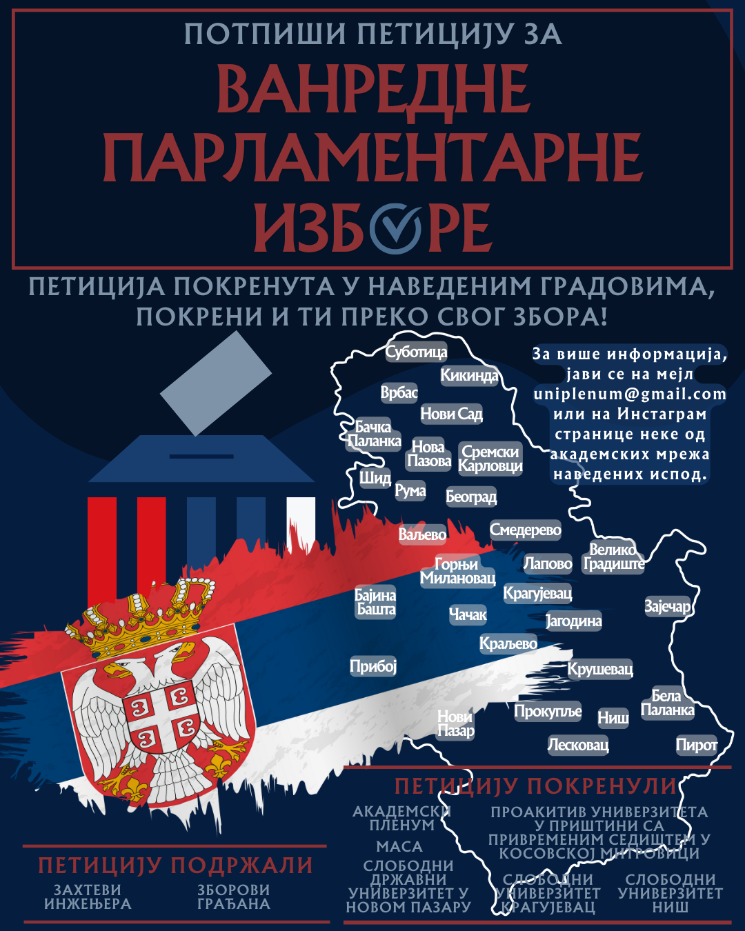 Akademski plenum, MASA, PROAKTIV Univerziteta u Prištini sa privremenim sedištem u Kosovskoj Mitrovici, Slobodni univerziteti u Nišu, Kragujevcu i Novom Pazaru, uz podršku građanskih zborova širom Srbije i neformalne grupe inženjera Zahtevi inženjera, pokrenuli su peticiju za raspisivanje vanrednih parlamentarnih izbora.