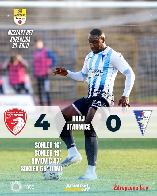 Radnički sada ima 41 bod na jedanaestom mestu na tabeli, a Spartak je pretposlednji sa 21 bodom, odranije bez ikakvih šansi za opstanak u elitnom rangu takmičenja.