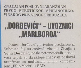 Naš (sarajevski) Marlboro je slovio za svetsku klasu ali je mnogima stvar prestiža bila da na stolu drže uvozni, u tvrdoj kutiji. Malo ko se seća da je 1991. godine preduzeće „Braća Đorđević“ iz Subotice dobilo licencu da distribuira originalni Marlboro na prostor bivše Jugoslavije. Tada niko iz Istočne Evrope nije imao ovakav aranžman. Nažalost, ta Jugoslavija je trajala još par meseci. Ipak, do naredne godine i uvođenja sankcija, stvarno su se prodavale američke cigarete Marlboro sa markicom na kojoj je pisalo „Braća Đorđević“.