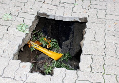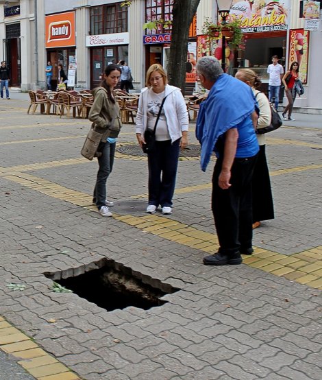 Meni licno se takodje pre nekih 20 godina desilo u jednoj zivoj trgovackoj ulici takodje u Nemackoj, da je iza mojih ledja svega par metara dalje, jednostavno propao trotoar i stvorila se rupa od nekih 2m u precniku i oko 3m u dubinu. Niko nije stradao, ali mogu reci da je to prilicno glup osecaj.