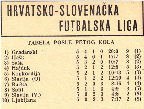Čast nam je izvijestiti Vas, da su prema sugestijama i odobrenju danim na godišnjoj skupštini H.Š.S. od 14. svibnja o.g. na plenumu upravnog odbora, održanog sinoć, jednoglasno imenovani sledeći klubovi u HRVATSKU LIGU : 1/ BAČKA Subotica, 2/ CONCORDIA Zagreb, 3/ GRADJANSKI Zagreb, 4/ HAJDUK Split, 5/ HAŠK Zagreb, 6/ SAŠK Sarajevo, 7/ SLAVIJA Osijek, 8/ SLAVIJA Varaždin, 9/ SPLIT Split „