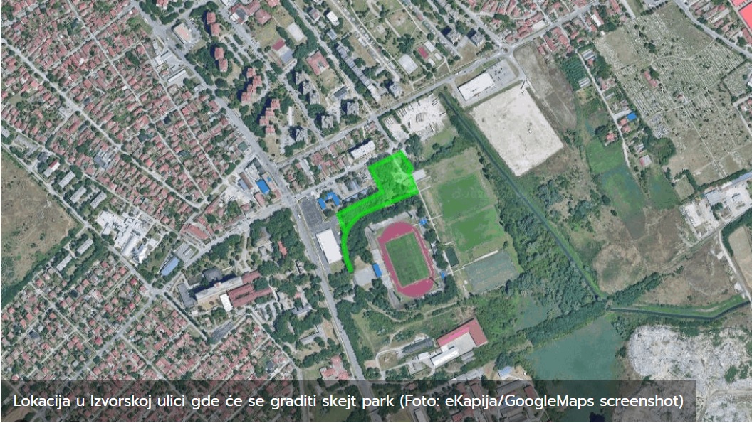 Radovi na izgradnji skejt parka izvodiće se na delu ove parcele, na površini od 9.828 m² u Izvorskoj ulici.