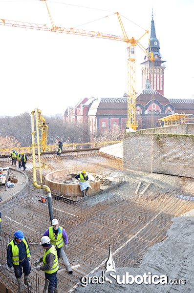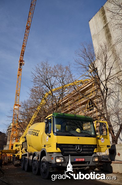 Prošle nedelje se postavljala oplata i polagala armatura za izlivanje betonske ploče iznad stepeništa starog dela Narodnog pozorišta. Današnje više dnevne temperature, kao i one najavljene za nekoliko narednih dana, omogućile izvođačima nesmetano izlivanje betona.