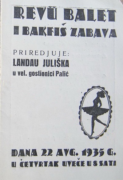 Godišnjica učiteljice plesa iz Subotice, Juliške Landau, biće proslavljena na Duhove u Gradskom pozorištu. Proslava izaziva opšte interesovanje u Subotici, tim pre što su mnoge generacije završile njenu plesnu školu. Odlična učiteljica plesa dala je značajan doprinos, posebno u podizanju standarda amaterskih nastupa. Mnoge predstave oživela je svojim kreativnim plesnim komadima, sa odličnim ukusom, pohvalnim talentom i idejama. Iz njenih stručnih ruku izniklo je nekoliko velikih talenata, kao što su Baba Tot, balerina, trenutno po ugovoru u Francuskoj. Magda Vajs, dečja primadona koja danas živi u inostranstvu, i mnogi drugi koji su već napravili karijeru u oblasti plesa.