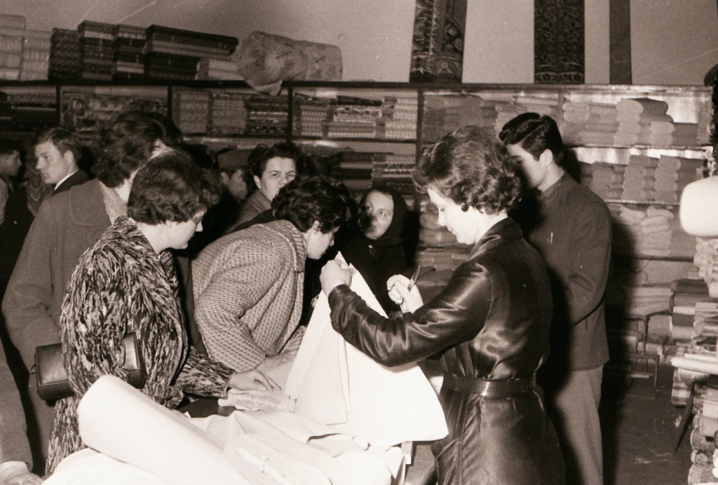 Na poslednjoj slici se lepo vidi mlada zena sa „trajnom“ i makazama u ruci, ocito prodavacica tkanina na metar. Odevena je u radnu kecelju od tamnoplavog, skoro crnog satena, kakve su nosile sve prodavacice u robnim kucama „Na-Ma“ u Subotici. Takva radna odeca je tim zenama davala odgovarajucu serioznost i eleganciju. Sto je najvaznije poznavale su perfektno svu onu robu, odnosno tekstil koji su prodavale. Tadasnji trgovci su se odlikovali solidnim i fundiranim znanjem o svemu onome sto su prodavali. Narocito oni koji su poslovali sa elektrotehnickom robom. Mnogi su imali osim trgovackog jos i odgovarajuce strucno-zanatsko obrazovanje. Na pretposlednjoj slici mi se cini (ne bih stavio ruku u vatru) da je napravljena na Korzu u prodavnici „Tehnika“. To zakljucujem po artiklima koji se mogu videti u regalima u pozadini. Mi vidimo pegle, elektricne resoe za kuvanje, telefone (i to bele) mlinove za kafu, elektricne aparate za brijanje, volt i ampermetre, elektro kablove, i jednu lampu za nocni ormaric. Dakle uglavnom sve sama roba siroke potrosnje i ujedno izvesni indikator tadasnjeg zivotnog standarda gradjana, i to nakon jedva petnaestak godina od zavrsetka WW2. Ako pogledamo prema gornjem desnom uglu fotografije, videcemo jedan poveci kotur elektrokabla i porcelanske osigurace. Najverovatnije musterija uvodi struju u svoju novu kucu ili renovira vodove u staroj. Bilo je to vreme napretka i optimizma i kada se mislilo – Samo nebo je granica.