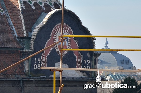 Planinari subotičke firme "Glečer vertikal" odvalili su juče sve nepostojane delove fasade Gradske kuće koja je okrenuta prema zelenoj fontani.