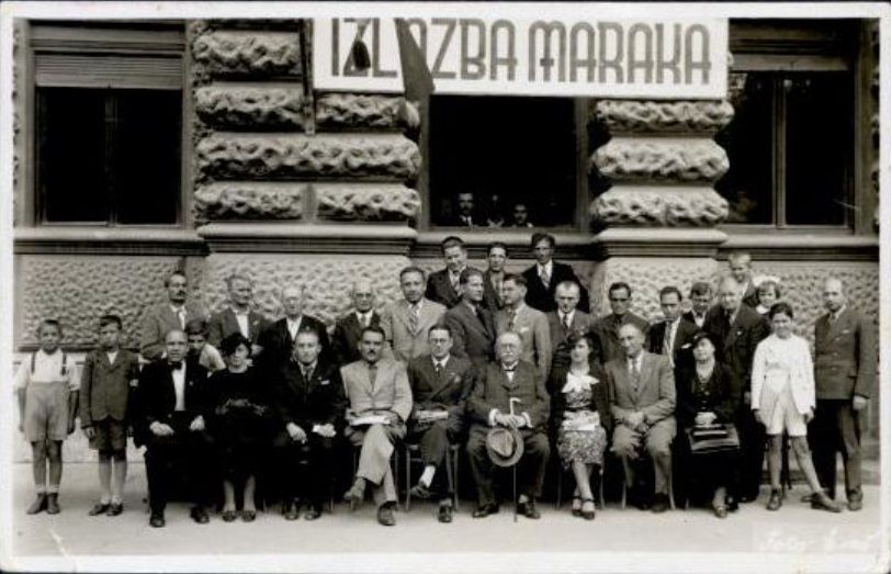 Ministar saobraćaja Mehmed Spaho (u sredini) na izložbi u Žutoj kući, 1936. godine