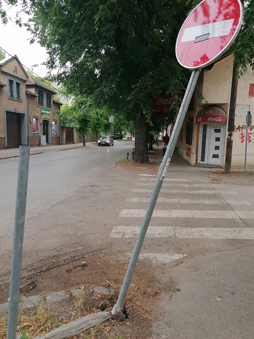 U toj ulici već duže vreme u delu pešačke zone postoji visoki stepen rizičnosti od ugrožavanja pešaka i prometa vozila. Opasnost predstavljaju saobraćajni znaci koji su ,,pričvršćeni“ jedan za drugi po površini zemlje najlonskom trakom od kojih jedan znak nema više ni svoju oznaku ili ga to ne interesuje uz ,,opravdanje“ da saobraćajna bezbednost građana nije u njegovoj nadležnosti?