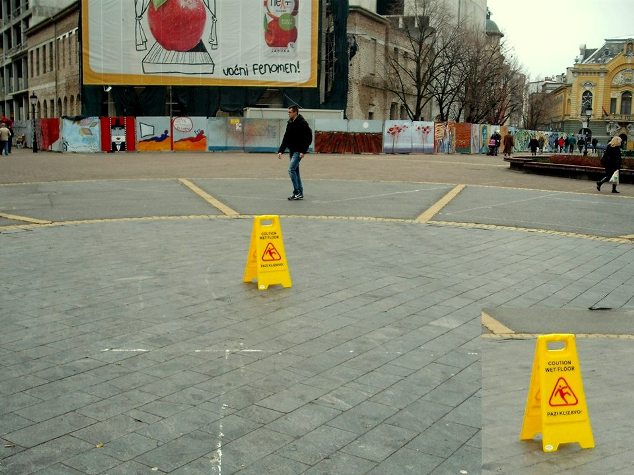 Na glavnom gradskom trgu, pojavila se tabla sa upozorenjem, što je novost za one koji drže do gradskih manira. Da li neka gradska služba ili neko treći, ipak je preduzeo nešto glede klizavice.