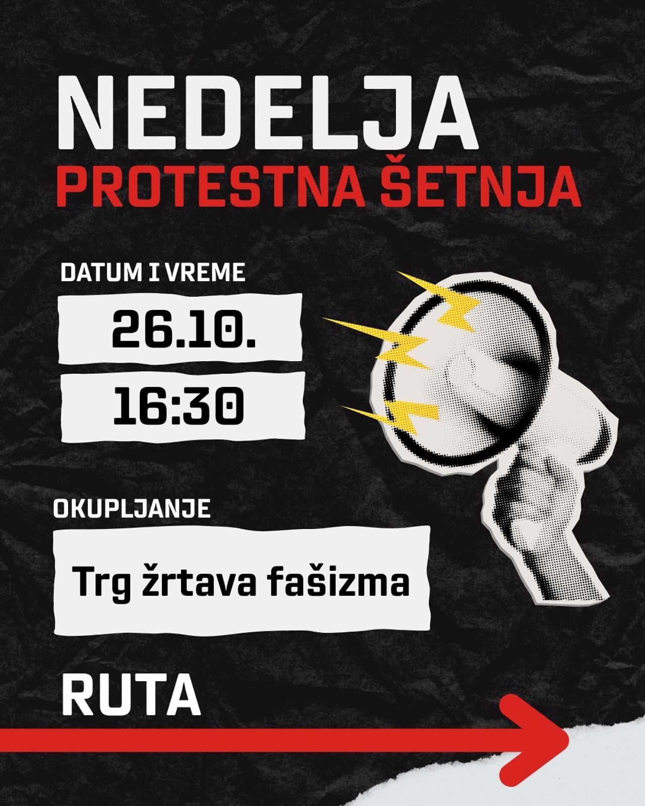 Okupljanje je na Trgu žrtava fašizma u 16.30 časova, odakle će se kolona uputiti ulicom Matka Vukovića i Zagrebačkom ka podvožnjaku u Maksima Gorkog kao krajnjem odredištu.