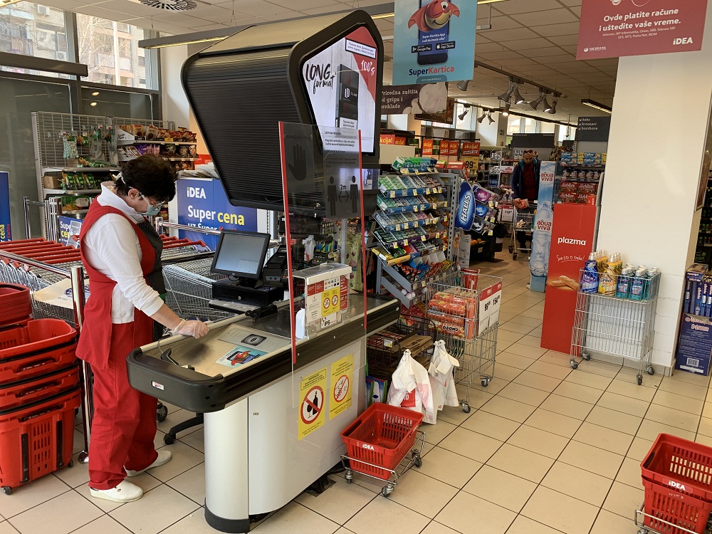 Idea i Roda marketi su montirali zaštitne table na kasama i svi zaposleni nose zaštitne maske i rukavice. Na ulazu u Skala green se vrši dezinfekcija svih kupaca. Ruke i stopala. Radnici su takođe zaštićeni maskama i rukavicama.
