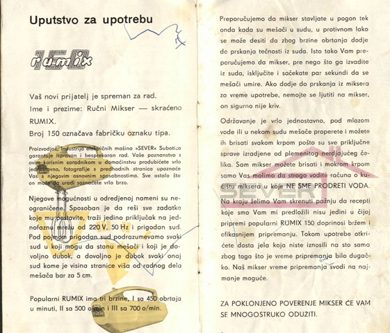 Subotička industrija velikih elektro motora rešila je da se pozabavi i onim malim, za kućnu upotrebu. Tako je rođen Rumix 150, subotički ručni mikser sa tri brzine. U ilustrovanom prospektu nalazi se detaljno uputstvo za jednostavno rukovanje i dvadeset recepata za jela i slatkiše za čiju pripremu je sada potrebno mnogo manje vremena. Neki od tih recepata su i za koktele i poslastice iz internacionalne kuhinje, da celoj stvari dodaju još malo modernosti.