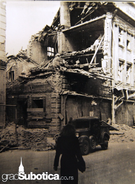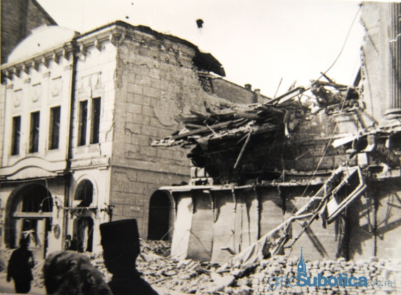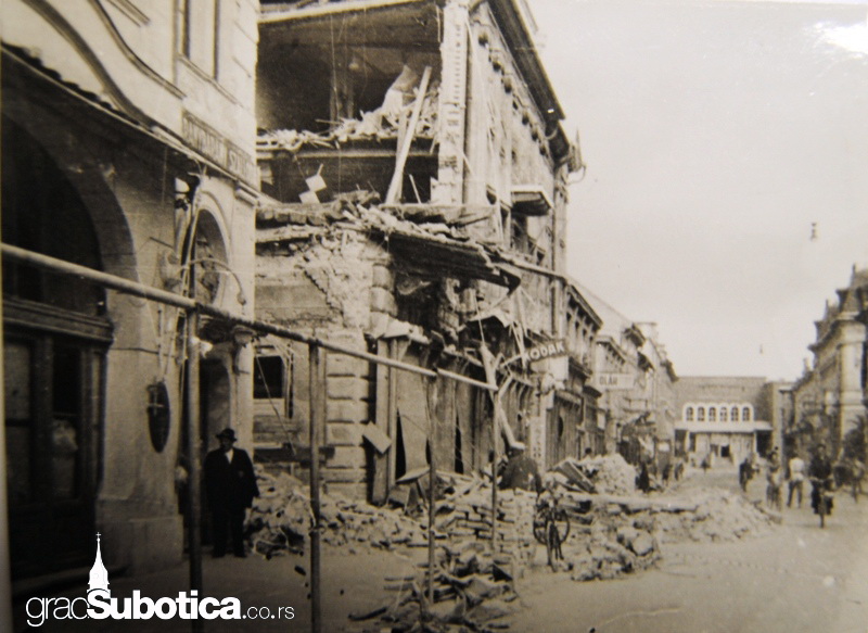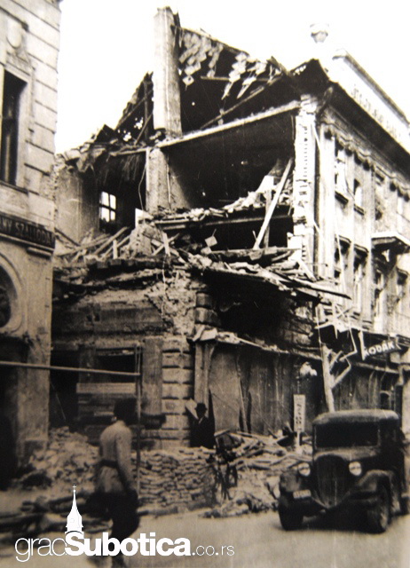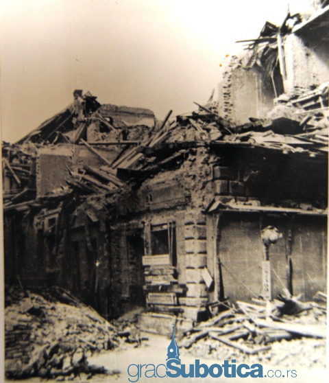 Centar Subotice srećom nije osetio teško bombardovanje, jedino je tu i tamo pogođena po neka kuća. Slučaj je hteo da je zgrada na uglu Aleksandrove i Karadžićeve ulice potpuno srušena. Njezine ruševine zakrčile su već i onako usku Karadžićevu ulicu, tako da je prolaz kroz nju jedva moguć, samo za pešački saobraćaj.