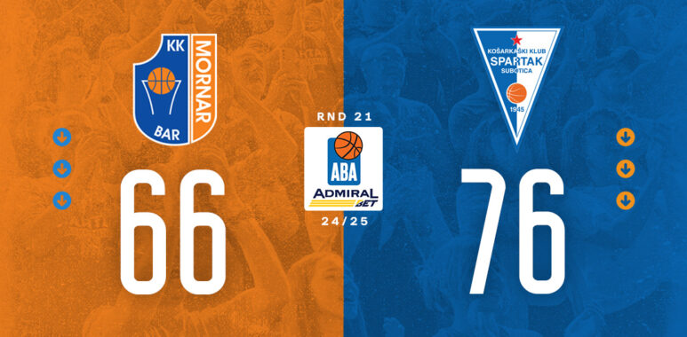Košarkaši Spartaka iz Subotice pobedili su u gostima Mornar rezultatom 76:66 (14:22, 20:14, 17:20, 25:10), u meču 21. kola ABA lige.
