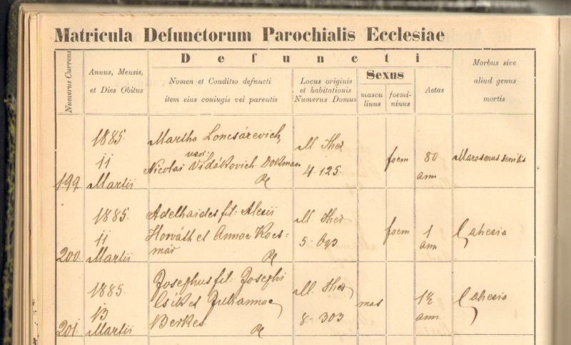 Velik broj dece koja nisu prezivela prvu godinu zivota, i majki koje su umirale ubrzo nakon porodjaja, svedoce o niskim granama tadasnje medicine. Madjarski lekar Ignac Fülöp Semmelweis rodjen u Budimu 1818 je prvi lekar koji je prakticno u jednoj bolnici u Becu, primetio korelaciju „prljavih ruku“ sa kauzalitetom smrtnosti novorodjencadi kao i porodilja. Tamo bi studenti i lekari direktno iz sale za autopsiju prelazili u porodjajno odeljenje i bez pranja ruku nastavili sa porodjajima. Posleice su bile katastrofalne. Na selu gde su se porodjaji obavljali kod kuce, tako reci izmedju stale i kokosinjca, situacija je bila jos gora. Bunari sa vodom za pice su ne retko bili odmah pored gomile stajskog gnojiva, sto je zaokruzilo djavolski krug. Dr. Semmelweis je bio ismevan zbog svoje teorije o dezinfekciji i strogoj higijeni, pobijali su ga i proganjali, i na kraju je smesten u ludnicu gde je i okoncao svoj zivot. Pretpostavlja se da su mu i „malo pomogli“ da umre. Veliki mortalitet novorodjencadi je iziskivao isto tako i veliki natalitet. Na selu i u zanatskim radionicama je svaka ruka bila dobrodosla i vazna. Osim toga deca su roditeljima bila garant egzistencije u starosti. Neka vrsta penzijskog osiguranja. Logika je bila – sto vise dece time sigurnija buducnost. Zivotni vek je bi relativno kratak, umiralo se prilicno rano ljudi preko 50 godina su bili retkost, a oni preko 60 pravi metuzalemi. Uzrok smrti takodje mozemo samo nagadjati. Onaj kome pise da je umro od ludila, verovatno je imao Alchajmerovu bolest.