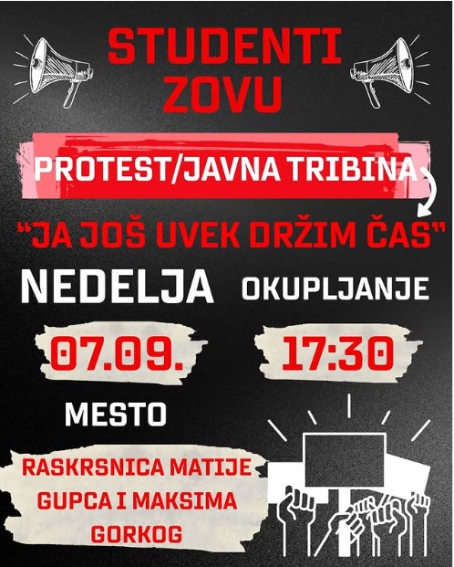 Subotički studenti u blokadi uputili su poziv građanima i građankama da im se pridruže na protestu koji su nazvali “Ja još uvek držim čas”, a koji će biti održan u nedelju, 7. septembra.