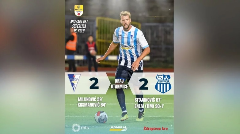 U okviru 16. kola Super ligee Srbije, Spartak i OFK Beograd su večeras u Subotici igrali nerešeno, 2:2.
