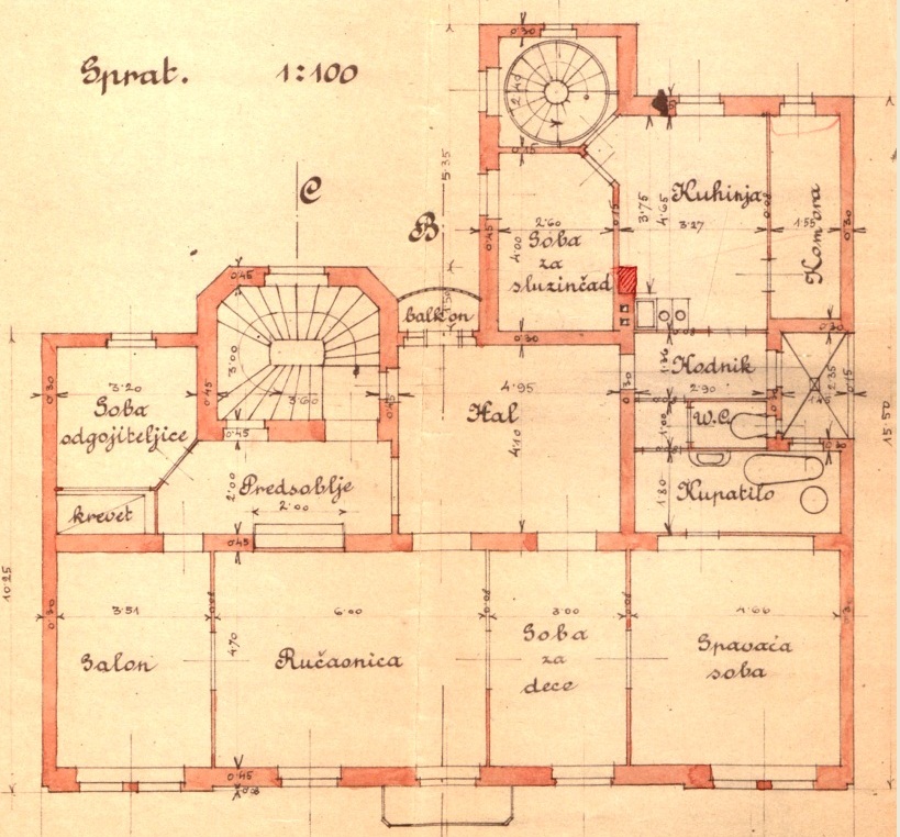 Da vidimo kako je izgledao stan na spratu. Tu je hol, i hodnik i predsoblje. Hodnik vodi u kuhinju (sa posebnim ulazom i komorom) i sobu za služinčad a predsoblje vodi u „sobu za odgojiteljice“. WC i kupatilo su odvojeni, soba za decu je do spavaće sobe a tu su i salon i ručaonica. Sve u svemu, jedan komforan stan za svoje vreme.