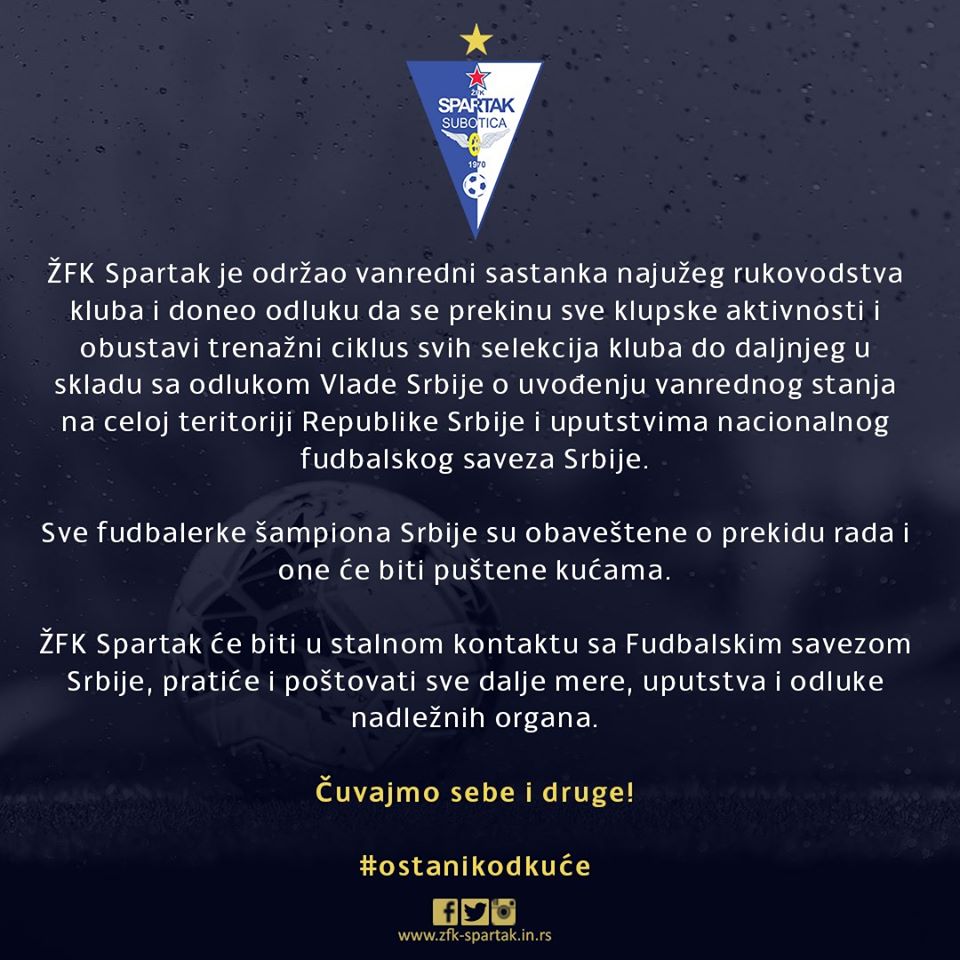 Poslednje 14. kolo Spartak je završio goleadom. Odlukom državnih organa ligaški deo takmičenja odigran je pred praznim tribinama. Alina Baka otvorila goleadu. Prečke, stative, ali najviše nepreciznost „golubica“, od kiše golova sačuvale mrežu vrlodobre Ivane Mijailović.