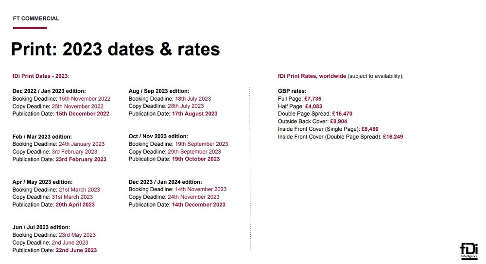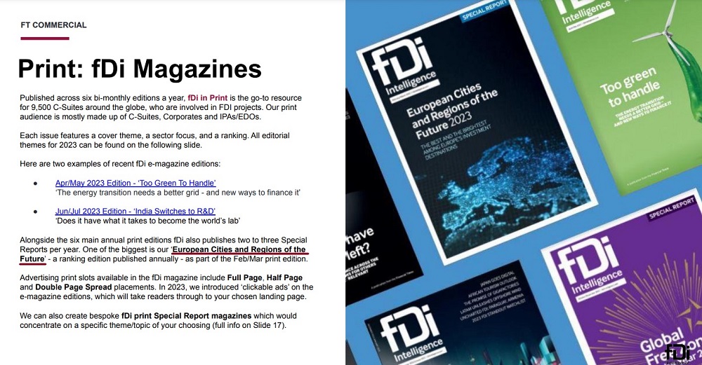 Da je to tako, svedoči cenovnik „FDI intelidžensa“. U delu cenovnika za 2023. godinu, koji se odnosi na reklamiranje u šest dvomesečnih štampanih izdanja pod paskom portala Fdiintelligence.com, navedeno je šta sve oglašivač dobija.